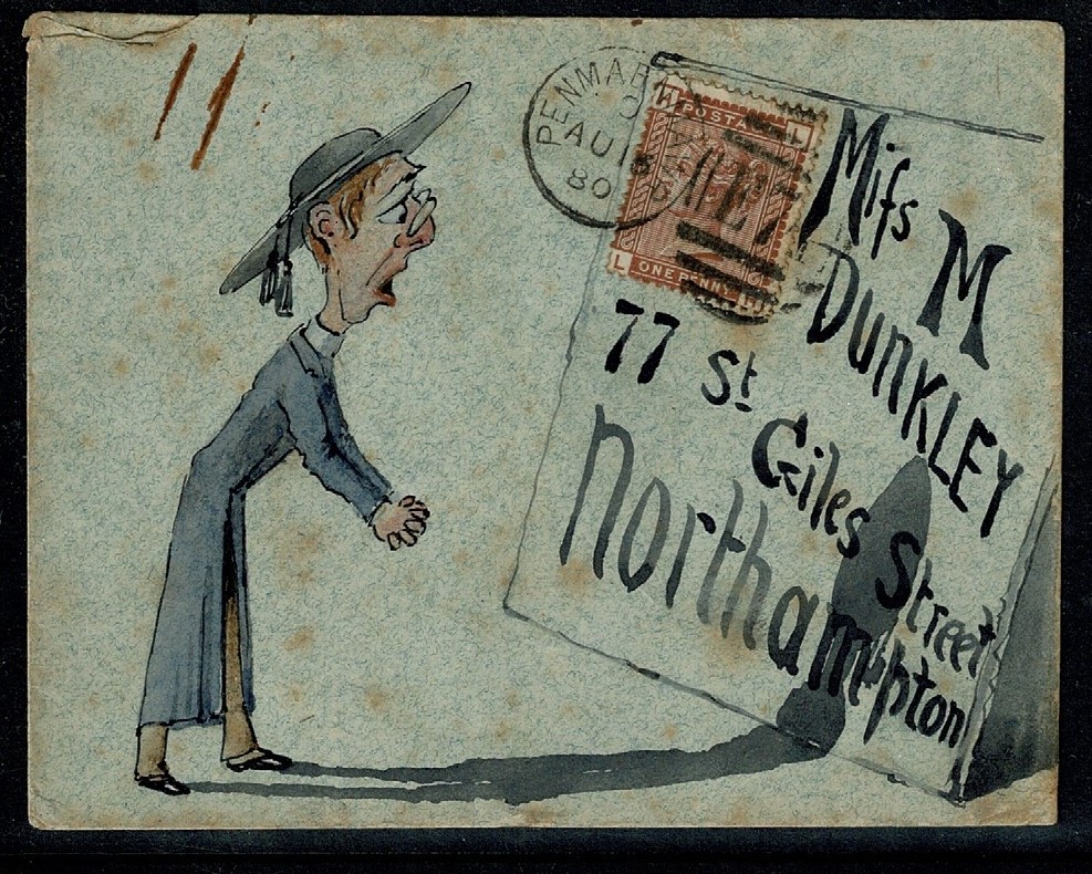 Hand sketched envelope depicting a vicar and his shadow. 1d venetian red cancelled with Penmaenmawr duplex. Some foxing but attractive colouring with well defined and clear illustration. As illustrated.