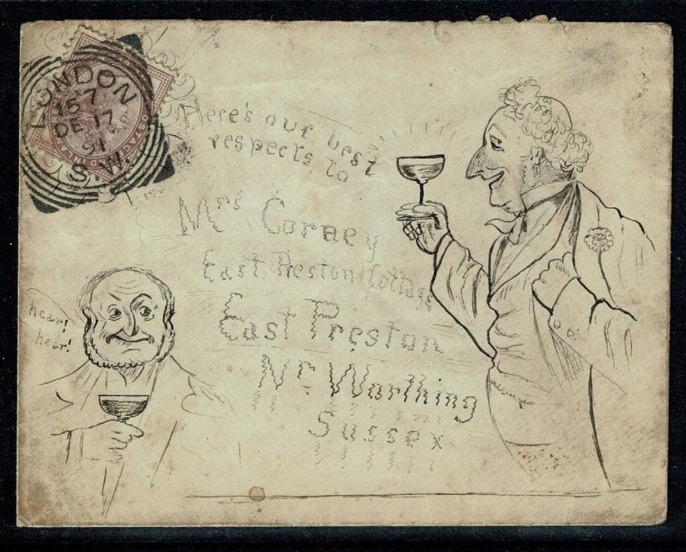 Hand sketched envelope depicting two old men drinking with ornate address. Die II id lilac cancelled with London SW squared circle. As illustrated.